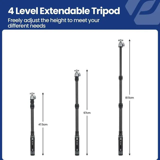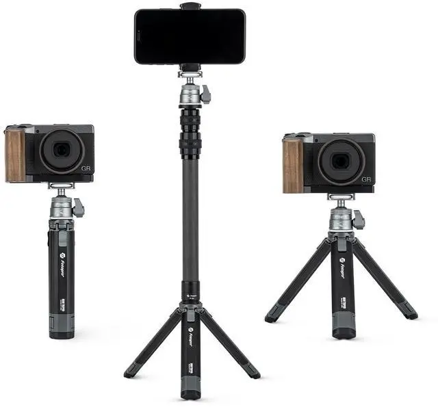 Sturdy & Stable: Fotopro mini camera tripod adopts all-metal material, stable structural design and rubber feet, maximum weight capacity up to 4.41 pounds, extension pole maximum weight up to 22.01 pounds. ^^ Carbon Fiber