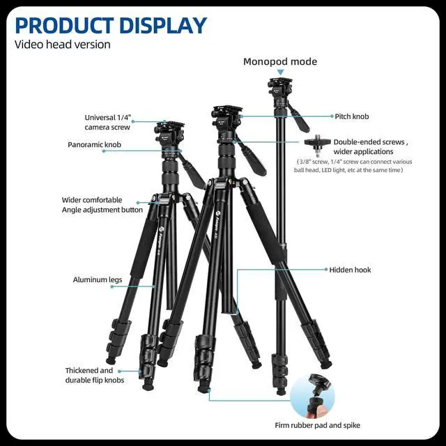 Fotopro delivers an ultralight yet robust tripod that effortlessly supports heavy gear while remaining easy to carry. Enjoy versatile shooting with a wide height range and instant monopod conversion, all backed by rock-solid stability thanks to multi-section legs and a precision ball head. Quick-flip locks ensure fast setup, while the compact foldable design makes it ideal for travel. Smooth 360 panning and adjustable angles give you complete creative controlevery shot, perfectly framed.