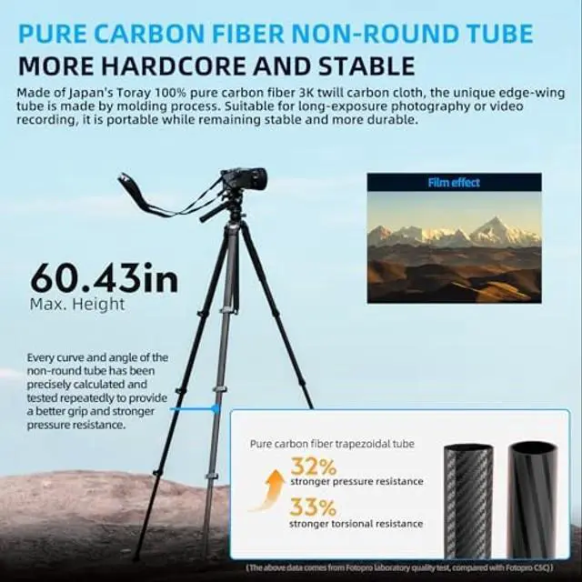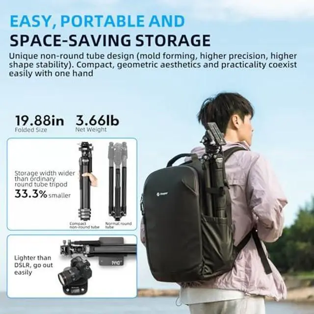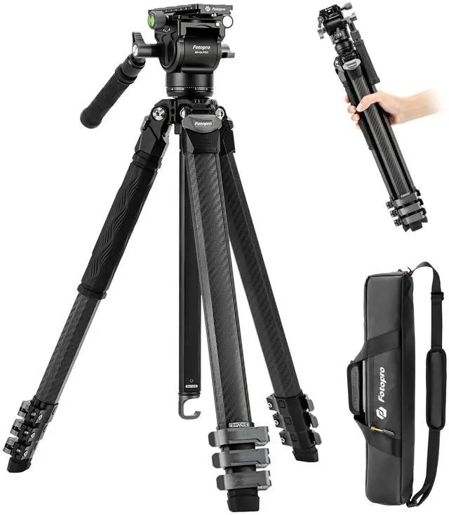 Compact Carbon Fiber Tripod: Weighing only 1.66 kg ( 3.66 lbs), the Fotopro Origin Plus video tripod is crafted from Japan Toray 3K carbon fiber. Its compact folded size of 50.5 cm ( 19.88 inches) makes it easy to carry in a backpack or included shoulder bag ^^