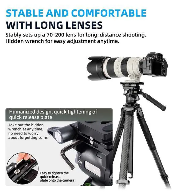 Reliable Stability Anywhere: The 4-section diamond-shaped carbon fiber legs with flip locks deliver secure positioning. Rubber feet ensure grip indoors, while spiked feet enhance outdoor stability. The ballast hook allows extra weight for wind resistance
