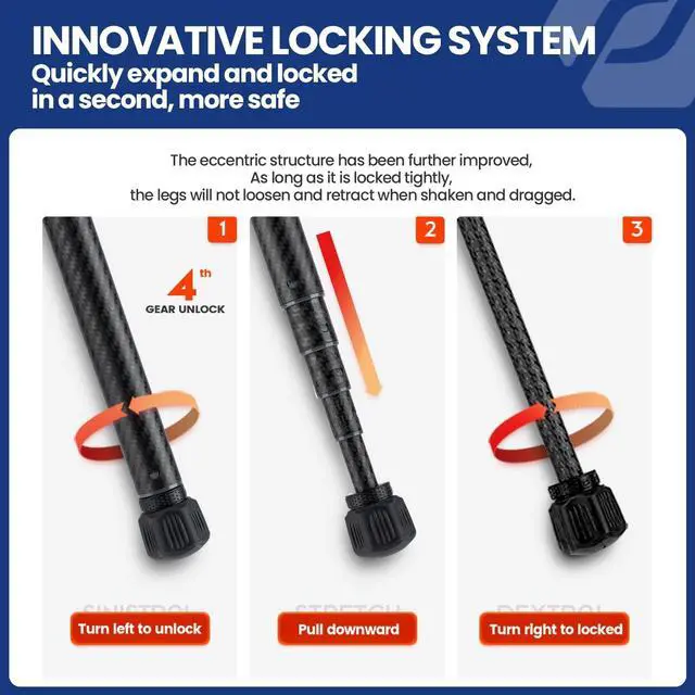 ^^ Sturdy and Expandable: 25MM pipe diameter, stable shooting in wind; 5-section carbon fiber tripod legs and twist-lock system allow you to easily adjust the height from 6.29 inches to 62 inches to meet various shooting needs.