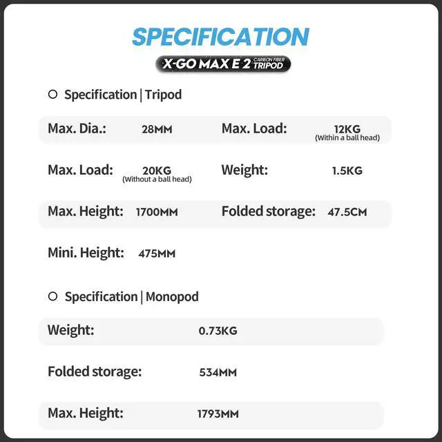 The X-GO Max E2 carbon fiber camera tripod is a lightweight yet sturdy choice for outdoor photographers, with a 12kg head load capacity and 20kg total load capacity. Weighing only 1.5 kg, it features a 28mm leg tube diameter and can transform into a monopod for versatile shooting. Adjustable height and angles, along with a 360-degree rotating head, cater to diverse photography needs. The tripod's anti-slip design, detachable counterweight hook, and portable foldable design further enhance its practicality for outdoor use.