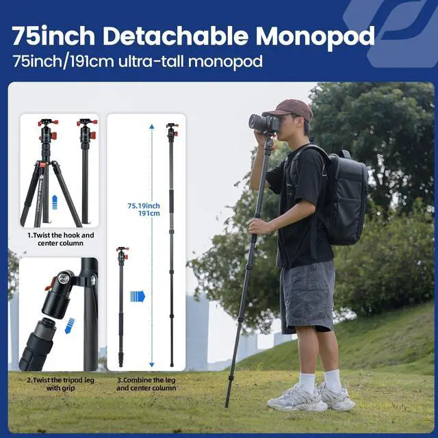 • 2-in-1 Tripod:The camera tripod can be quickly disassembled into a monopod using the central axis screw, providing another easy shooting option. The monopod can be used as a hiking stick or selfie pole, making it a great companion for hiking or traveling. The center column can be inverted for convenient low-angle shooting.