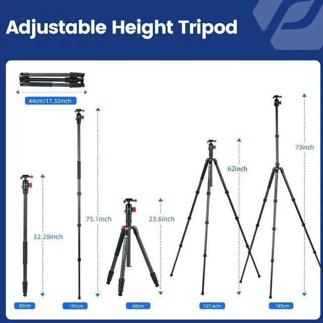 Various Adaptations: The carbon fiber tripod allows height and leg angle adjustments. With 4-section legs with twist locks, the tripod can extend from 18.7 inches to 73 inches (44cm to 185.42 cm) in seconds, providing heights to meet most photography needs. The tripod legs can be adjusted in three levels, allowing photographers to shoot from various angles and positions. This feature is particularly useful in landscape and wildlife photography, where the terrain may be uneven or sloped.