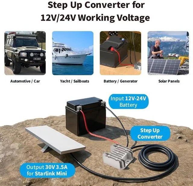[Designed for Starlink Mini] Converts 12V or 24V DC to a stable 30V 3.5A output, ensuring reliable connectivity in vehicles, boats, and off-grid setups. ^^ [Wide Voltage Input] Accepts 928V DC from cars, RVs, marine batteries, or solar panels without the need for additional converters. ^^ [IP68 Waterproof & Shockproof] Aluminum alloy housing with silicone sealing resists rain, salt spray, dust, and impact for dependable outdoor use. ^^ [Multiple Safety Protections] Built-in safeguards prevent overvoltage, overcurrent, overheating, and short circuits to protect your Starlink Mini.