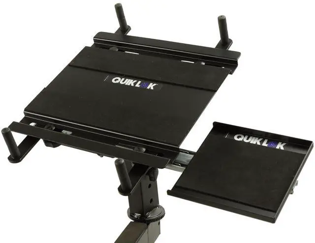 Universal laptop mount for use with Z-style keyboard stands. Can accommodate virtually any size laptop. Four stoppers, adjustable in width and depth, will securely anchor any size laptop without interfering with input/output ports, expansion slots, cd-rw/dvd drivers, or AC adapter sockets placed on either side of the laptop. The laptop tray is height and tilt adjustable and swivels 360 degrees to allow for ideal positioning. Equipped with a pull out mouse tray that can be positioned on either the right side or the left side, and is retractable for easy storage and transport.