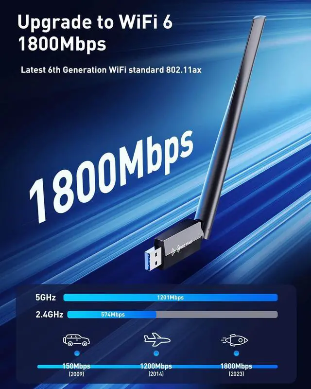 Fast Speed 1800Mbps WiFi Adapter for desktop pc - Based on the advanced wifi 6 802.11ax technology reduce lags for PC. Upgrade your 300M usb wifi adapter to 1800Mbps wifi adapter,the WiFi 6 adapter provides long rang and stable wifi connection. You can enjoy fast speeds and a stable connection, Perfect for gaming, streaming, and downloading