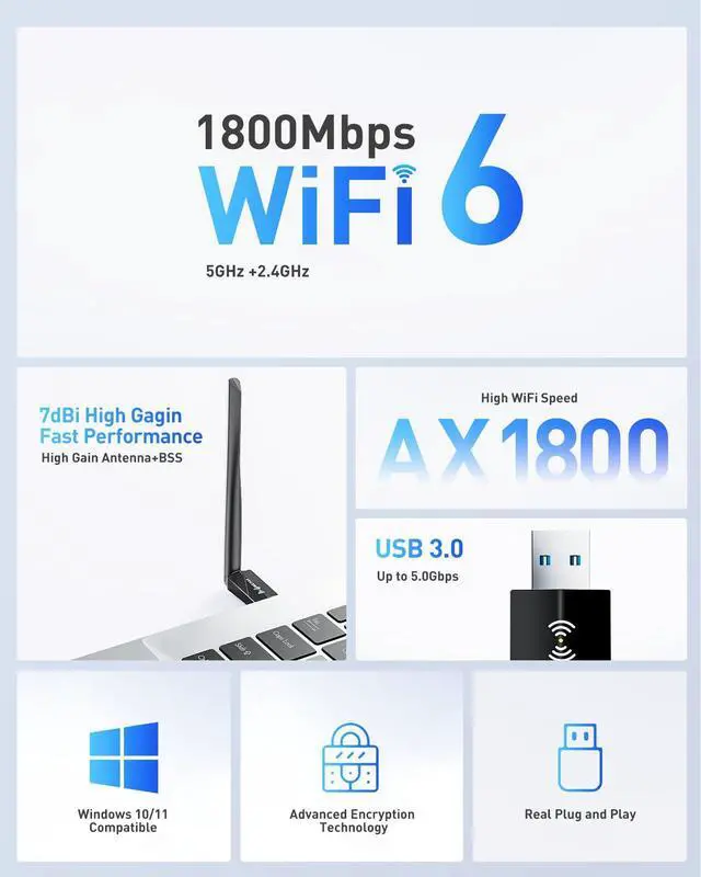 Dual-Band 2.4GHz and 5GHz WiFi 6 Adapter - The 1800Mbps usb wireless adapter offers speeds of up to 1200Mbps on the 5GHz band and 576Mbps on the 2.4GHz band. The wireless usb wifi 6 adapter supports seamless dual-band operation, ensuring that the usb wireless adapter for pc maintains high-speed performance throughout its usage. The network stability of the wifi 6 usb adapter supports greater network flexibility, stronger signals, ultra-low latency, and there will be no buffering or interruptions