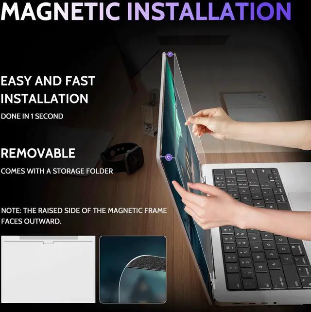 [(SUPER EASY INSTALLATION)] Peslv macbook air screen protector uses a magnetic installation method. The top bezel integrates magnetic functionality; aligning the screen protector's top bezel with the MacBook screen's top bezel and gently pressing will complete installation within one second. (Note: During installation, ensure the slightly raised side of the screen protector's top bezel faces outwards).
