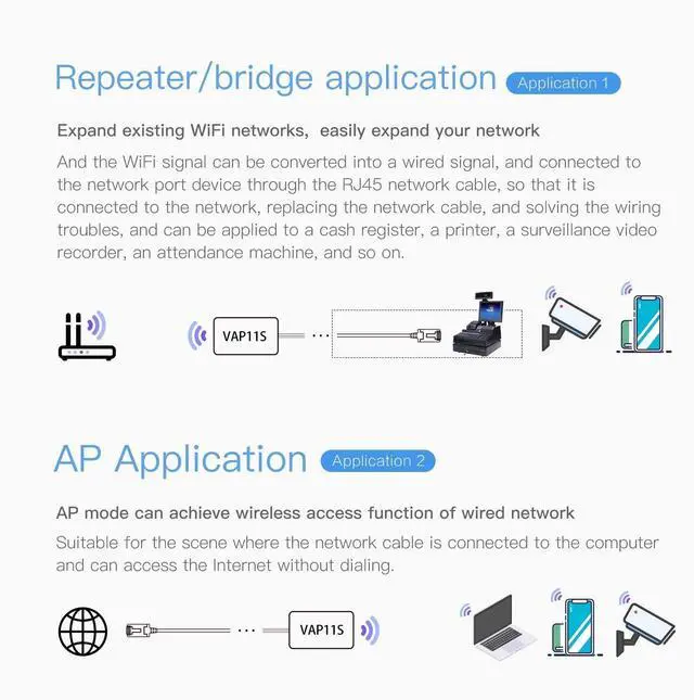 [(Multiple Application Methods)] Router mode (support WiFi WAN uplink and WAN/LAN exchange), WiFi Repeater(can extend WiFi transmission distance), WiFi Bridge( IP layer or MAC layer transparent transmission). Perfect for Network Printer, PLC, robot, monitor, DVR, IP camera, Medical devices, IoT devices, Video transmission, POS Cash Register, PS3, and more network applications.