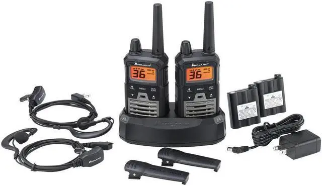 This value pack includes four Midland X-TALKER T290 two way radios with belt clips, four headsets with boom microphones, four rechargeable NiMH batteries, two desktop chargers, two AC adapters, owner's manual and a 3 year manufacturer warranty from Midland.