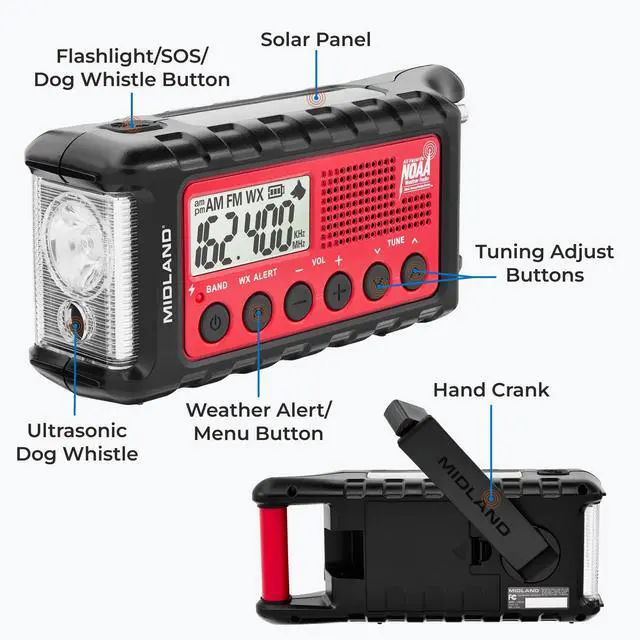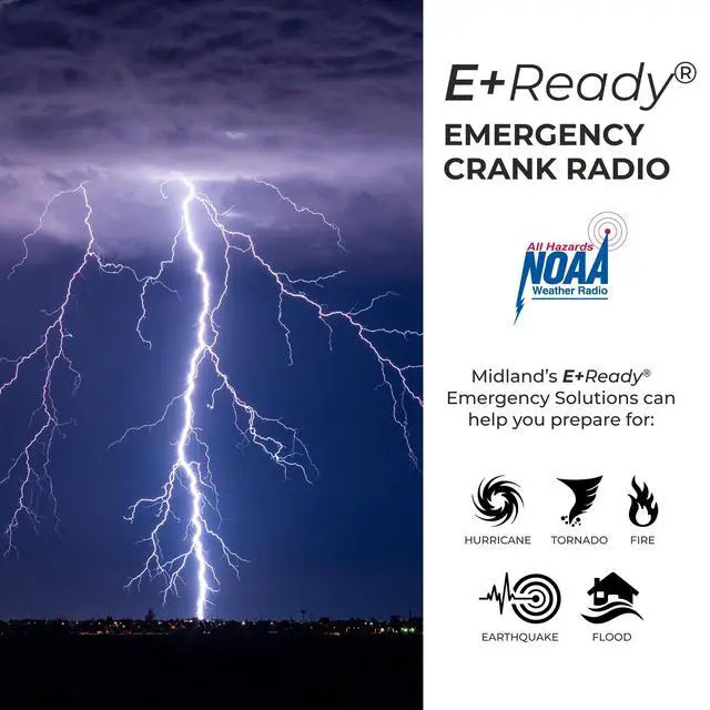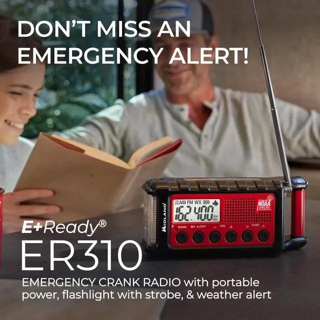 MULTIPLE POWER SOURCES - The ER310 features 3 sustainable power sources to recharge your radio: Solar Panel, Hand Crank, & Rechargeable 2600 mAh Battery. SOLAR PANEL - Simply recharge the internal lithium ion battery with direct sunlight. HAND CRANK - Recharge the radio during a power outage or anytime away from a power source. RECHARGEABLE 2600 mAh BATTERY - The rechargeable & replaceable long life battery provides up to 32 hours of radio operation. The ER310 can also be powered by 6 AA Batteries (Not Included) as a backup power solution. ^^ EMERGENCY FLASHLIGHT - The SOS FLASHLIGHT BEACON flashes Morse code in an emergency scenario and the Bright CREE LED (130 Lumens) can be used to signal for help. Select the Low brightness setting to conserve battery life or the High brightness setting for maximum illumination. ^^ NOAA WEATHER SCAN + ALERT - NOAA Weather Scan will automatically scan through 7 available weather (WX) band channels and locks onto the strongest weather channel to alert you of severe weather updates. NOAA Weather Alert will sound an alarm indicating that there is a risk of severe weather in your area. AM/FM radio is also available. ^^ CHARGE EXTERNAL DEVICES - Quickly charge your portable devices (cell phones, tablets, etc.
