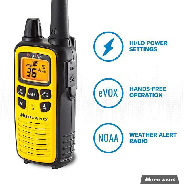2-WAY RADIOS - These walkie-talkies feature 36 FRS (Family Radio Service) channels, along with channel scan to check for activity. The bold yellow faceplate provides high visibility. ^^ 30-MILE RANGE - Longer range communication in open areas with little or no obstruction. ^^ 121 CTCSS PRIVACY CODES - The Continuous Tone-Coded Squelch System gives you up to 2, 662 channel options to help block other conversations. Use silent operation to turn off all tones. ^^ NOAA WEATHER SCAN + ALERT - NOAA Weather Scan will automatically scan through 10 available weather (WX) band channels and locks onto the strongest weather channel to alert you of severe weather updates.