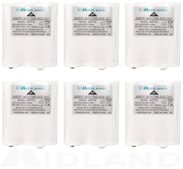 Part number: AVP13 Six Midland NiMH rechargeable battery packs, model BATT10. Works with Midland X-Talker T71, T75 and T77 two way radios.