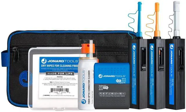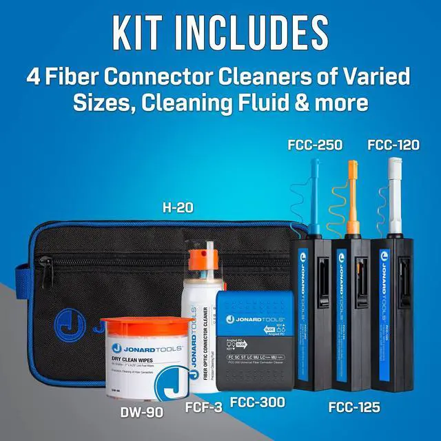 The kit features the following: Contains the product for both wet and dry cleaning of connectors providing flexibility and performanceEnclosed in our new H-20 Rugged Nylon Carrying Case and includes fiber cleaning fluid and wipesFiber connector cleaners can clean any LC, FC, SC, and ST connectors using patented 360 rotational tipsConnector cleaners can be used over 800 times eachCleaning fluid is hon-hazardous, non-flammable, fast-drying, does not use alcohol or water, and has unlimited shelf life if properly stored