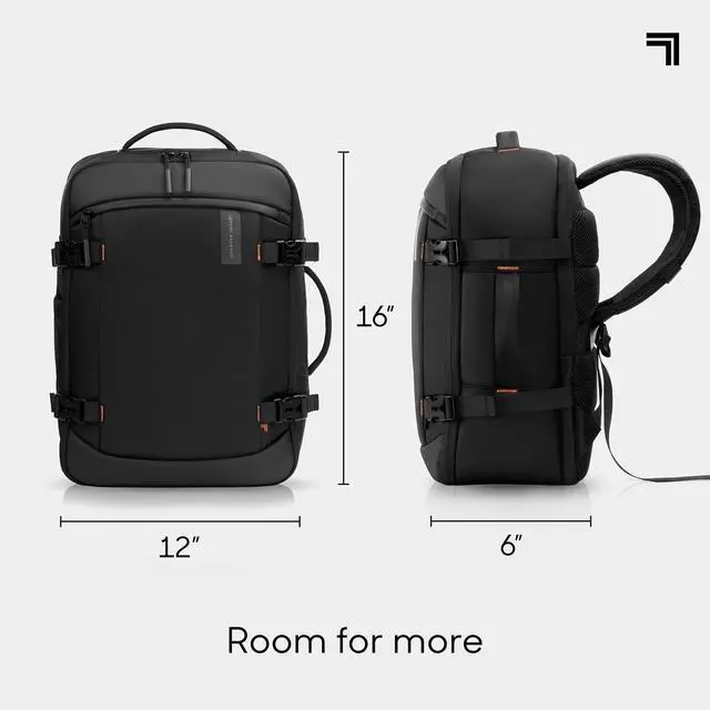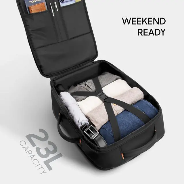 Smart Storage for Every Trip - This weekender backpack has a total of 5 pockets and fits up to a 17" laptop with a dedicated compartment, ensuring your tech stays secure while leaving space for clothes, accessories, and travel essentials. ^^ Effortless Organization - Designed with multiple easy access pockets and a beverage sleeve, this bag also fits as a personal item backpack for flights. This carry on backpack keeps everything you need neatly within reach while moving through airports or city streets. ^^ Travel Comfort Elevated - Engineered with padded and ergonomic shoulder straps, trolley strap for convenience, and a breathable back panel.