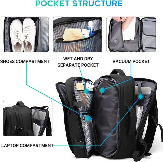 Expandable Capacity:Vacuum backpack before extended is 22L, dimensions are 17.5x11.8x5.5inch; after extended is 35L, dimensions are 17.5x11.8x9.5inch. You can expand the zipper and buckles according to your requirement. The two handles set on top and one side, which allow an easy switch between backpack and suitcase. So it can be carried vertically or horizontally.