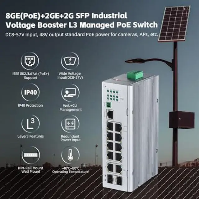 Binardat Industrial 12 Port Full Gigabit Solar POE Managed Switch,Input DC8V-57V to DC48V Voltage Booster, IEEE802.3af/at POE 240W, Web/CLI L3 Managed Ring DIN-Rail IP40 Switch