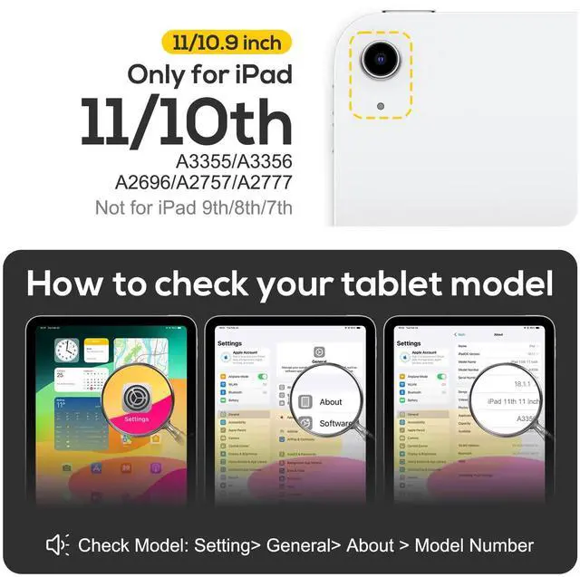 Compatibility: Specially designed compatible for the iPad A16 11th/10th generation 11-inch/10.9-inch 2025/2022 (Model: A2696 A2757 A2777), doesn't compatible for any other models. Especially doesn't compatible for iPad Air 5th/4th Generation 10.9 inch. Please check your iPad on the back bottom to confirm the "AXXX" model number before purchasing