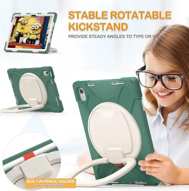 Multi-Function Handle / Kickstand: 360degrotating / 180degfolding grip, can be used as a handle, easy to hang your iPad in kitchen, washroom, bedroom; Kickstand is stable enough to stand on different surfaces for children to view. Button and port cover enable to proof dust