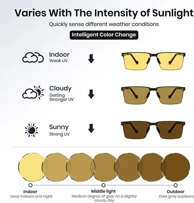 Advanced Photochromic Lens Technology: Our lenses automatically adjust to changing light conditions, providing clear vision indoors and transitioning to a darker tint outdoors for optimal eye protection and comfort