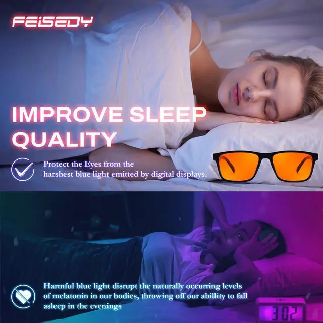 Better for Sleep - Numerous studies have shown that prolonged exposure to blue light can slow or stop the production of melatonin,Blue light exposure before going to bed will reduce the quality of sleep recovery. FEISEDY AMBER BLUE LIGH GLASSES helping your body produce melatonin faster and fall asleep faster and enjoy a more restful sleep.