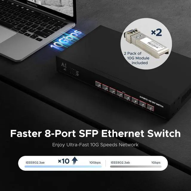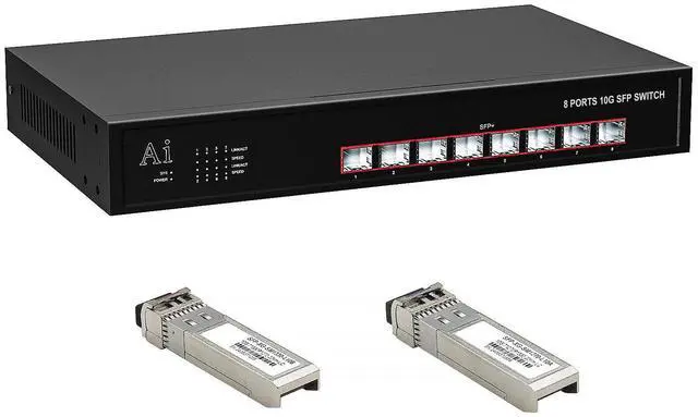 ienRon 8 Port SFP+ Switch with 1 Pair 10G Module Transceiver, Unmanaged Switch with 8 x 10 Gigabit and 10GBASE LC SMF Single Mode SFP Module, Support 1G/2.5G/10G | Plug & Play