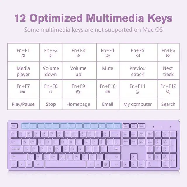 LeadsaiL Purple Wireless Keyboard, 2.4GH z Full-Sized Ergonomic Computer Keyboard, Cordless Noiseless Keyboard, 12 FN Shortcuts for Windows MacOS Laptop Computer