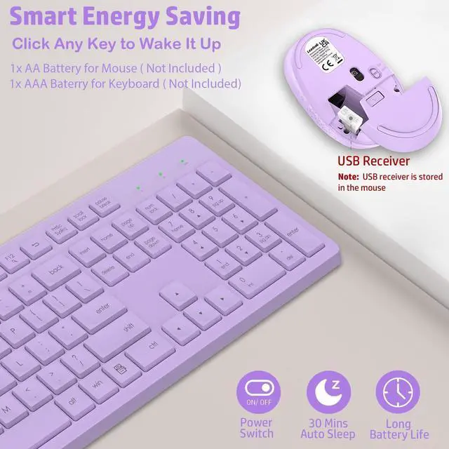 SMART ENERGY-SAVING SLEEP MODE: Both the keyboard and mouse feature intelligent power management. They automatically enter sleep mode after just 5 seconds of inactivity. Simply click or press any key to instantly wake them up. (Requires 1x AA battery for mouse, 1x AAA battery for keyboard - batteries not included). ^^ QUIET SILENT DESIGN FOR UNDISTURBED USE: Featuring scissor-switch keys and silent click technology, this keyboard and mouse combo operates remarkably quietly. Work or study late into the night without worrying about disturbing others. ^^ RELIABLE 2.4GH z
