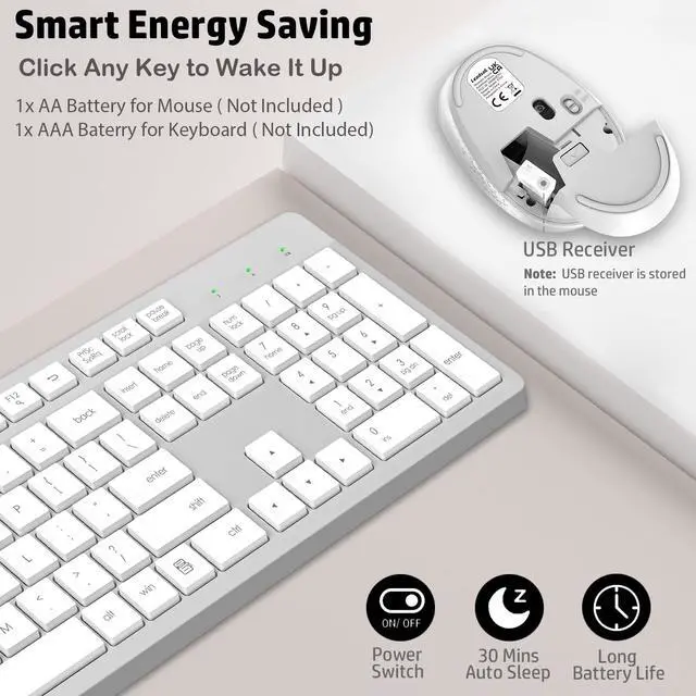 Auto Power-Saving: Enjoy up to 265 days of use on a single set of batterieskeyboard requires 1 AAA, mouse requires 1 AA. The combo automatically enters sleep mode after 10 minutes of inactivity to conserve power. Spend less time charging and more time working wirelessly.