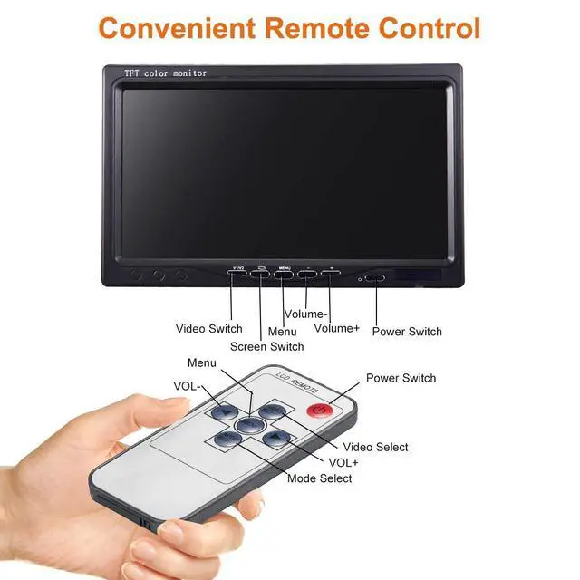^^ Package Included: 1 x 7" Car Monitor, 1 x Holder, 1x Frame, 1 x Video & Power Cable, 1 x Remote Controller, 1 x User Manual.