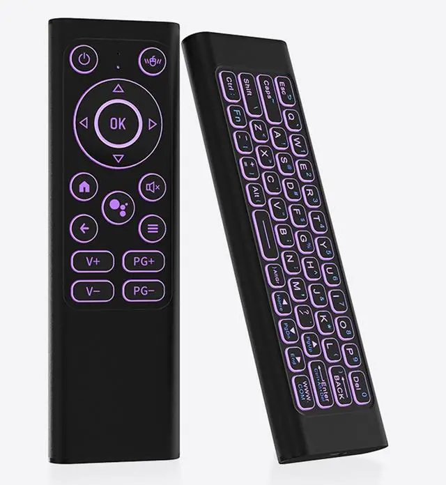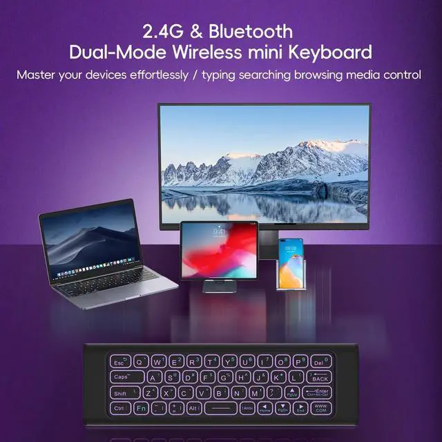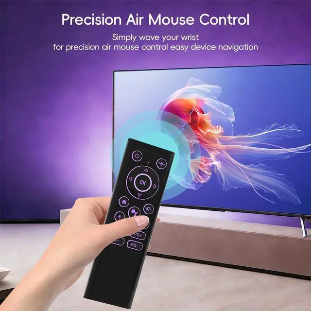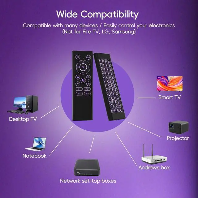 (All-in-One Wireless Control)Combine the functionality of a wireless air mouse, keyboard, and IR learning remote all in one. Perfect for Smart TV, Android TV Box, HTPC, projectors, gaming consoles, and PCsbut not compatible with Fire TV, LG, or Samsung devices. Control your entertainment and work setup with ease using a single device ^^ (Dual-Mode Bluetooth & 2.4G Connection)Enjoy dual-mode wireless freedom with Bluetooth and 2.4GH z USB receiver. Quick and easy plug & play setup with a stable, fast connection for use with Windows, macOS, Linux, Android, Smart TV, and more ^^ (Precision Mouse Control & RGB BacklightingEnjoy the precision of air mouse control for smooth and responsive navigation, scrolling, and clicking.