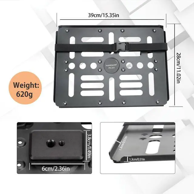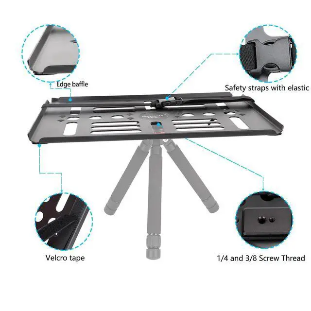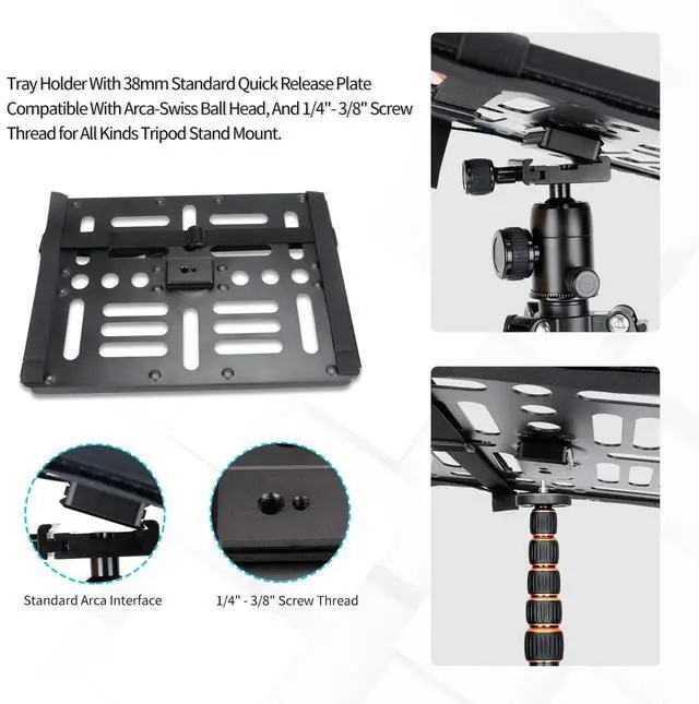 Dimension: 15.4 x 11 x 0.5 inch/39 x 28 x 1.3 cm. Fits laptop/notebook up to 17, Load 22lbs. ^^ Compatibility -The bottom of the tray has a 38mm Arcac-Swiss interface with all Arca Swiss clamp ballhad quick release adapters. and a 1/4 and 3/8 female screw for all tripod install; Easy to install and remove. ^^ Edge Barrier - To securely keep the laptop in place and prevent the laptop from sliding and falling, even if tilted forward. Extra ventilation holes significantly improve airflow to keep your laptop device cool. ^^ Widely Use - Sleek modern design compliments any mount and desk while adding extra desk space for storage. Perfect for offices, classrooms, lecture halls, meeting rooms, outdoor or your own home. ^^ Ergonomics - The Big Tray Holder is made to hold the laptop and projector on a tripod, helpful in providing an ergonomic workstation for your laptop to reduce neck and eye stress. (Tripod stand not included)