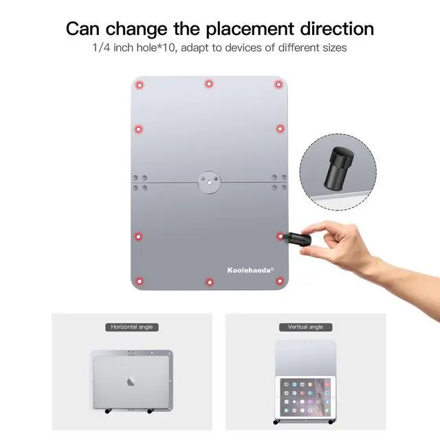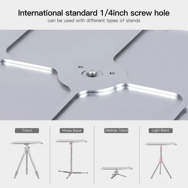 Widely Use - Sleek modern design compliments any mount and desk while adding extra desk space for storage. Perfect for offices, classrooms, lecture halls, meeting rooms, outdoor or your own home. ^^ Ample Surface Area - Measuring 13.34 * 9.84 * 1.57 inch, the tray provides sufficient space to accommodate laptops of various sizes, projectors, or other equipment, Can also be used as a desktop, enhancing your workflow efficiency. ^^ Compatibility - Easy to install and remove, the bottom of the tray has a 1/4" threaded mounting hole for Multiple mounting options for Light Stands, Tripods, Friction Arms.