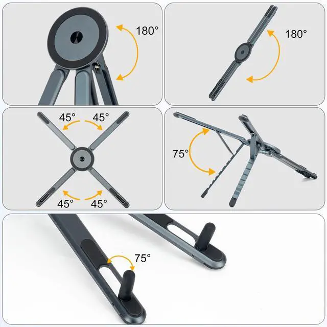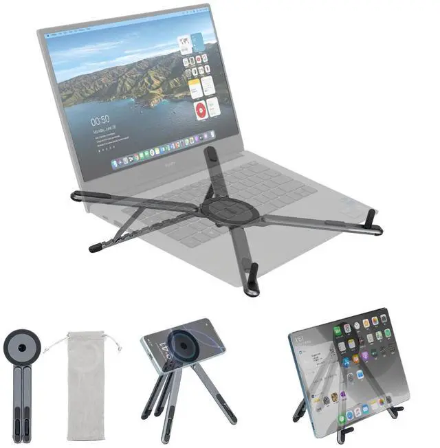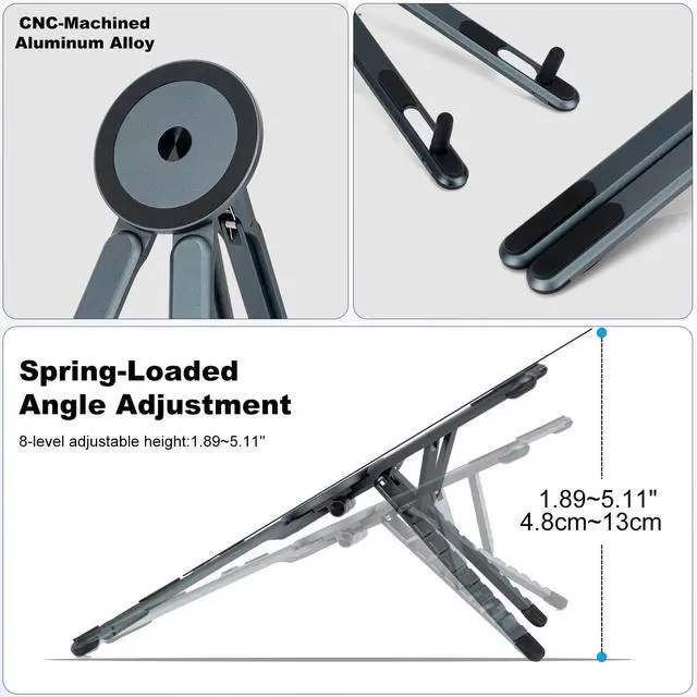 3 in 1 Multi-Purpose Stand for Laptop, Phone & TabletThis Aluminum Portable Laptop Stand is fits most laptops from 10 to 15.6 inches, It also fits for phone, tablets, kindle, books from 4 inches to 13 inches, and with magnetic phone for MagSafe iPhone, or a travel hanging stand for airplanes, buses, and trains. Switch between work, study, and travel modes anywhere with one compact device. ^^ Compact & Travel-Friendly Easy to Carry Anywhere This compact laptop stand folds down to 2.28 7.12 0.73 inches and weighs only 0.33 lbs, making it perfect for backpacks, purses, work bags, and carry-ons.
