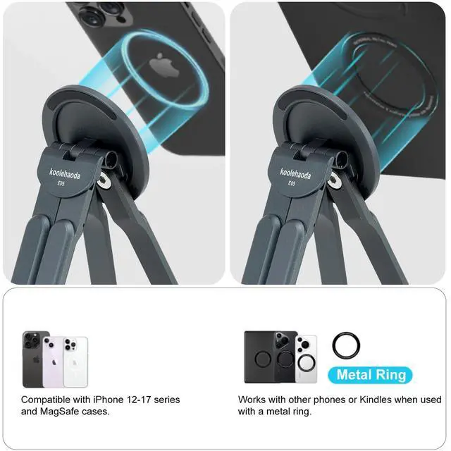 If your phone or case does not have Mag Safe function, you can stick the metal ring (included in the package) on the back of the phone or case to achieve strong magnetism. (Laptops and tablets are supported via the sturdy foldable stand design, not magnets. ) ^^ Premium Aluminum Alloy Build with Anti-Slip ProtectionMade from lightweight aerospace-grade aluminum for durability, stability, and heat dissipation. Silicone pads on edges prevent slips and protect your devices and desk surfaces. A stylish, small laptop stand solution for home, office, or travel.