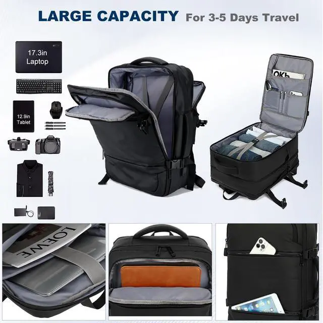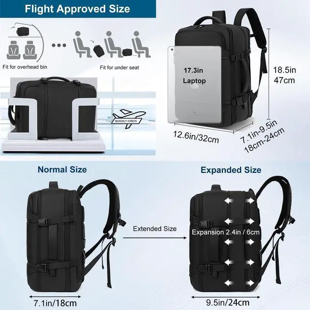 Storage Space & Pockets: Dimensions 18.5 * 12.6 *7 inch, Light Weight 1.2 Kg( 2.6 lb), Capacity up to 45L. 3 compartments, and a lot of pockets, providing a dedicated space for your pen, Laptops up to 17.3 inches, wallet, clothes, shoes, bottle and other travel essentials. This extra large travel backpack with expandable feature offers you more packing capacity. Unzipping to get 45L storage then can easily hold packing cubes, make up bag, outfits, camera bag and gear, etc ^^