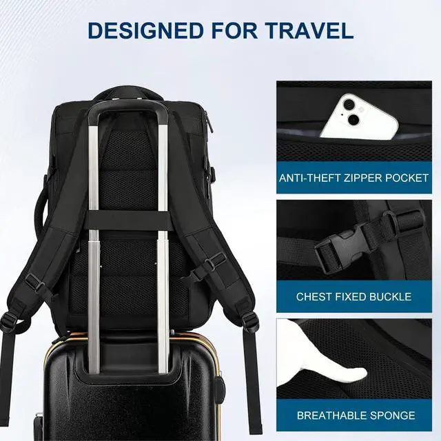 ^^ Functional & Safe: A luggage strap allows backpack fit on luggage/suitcase, This large travel backpack features a suitcase-style opening for easy access to your belongings at security checkpoints. There's also a padded electronics compartment and umbrella/water bottle pockets on the side. Hidden anti-theft zipper pocket on the back of the backpack to prevent your valuables from being stolen.
