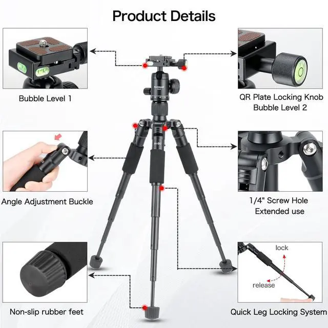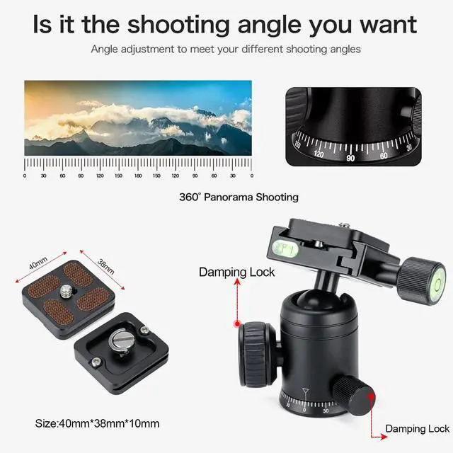 ^^: ) 360 swivel ball head with bubble level and Arca type quick release plate provides 360 panoramic movements and a 90 notch for vertical shooting scenarios, allowing you to take photos at any angle with horizontally and vertically.