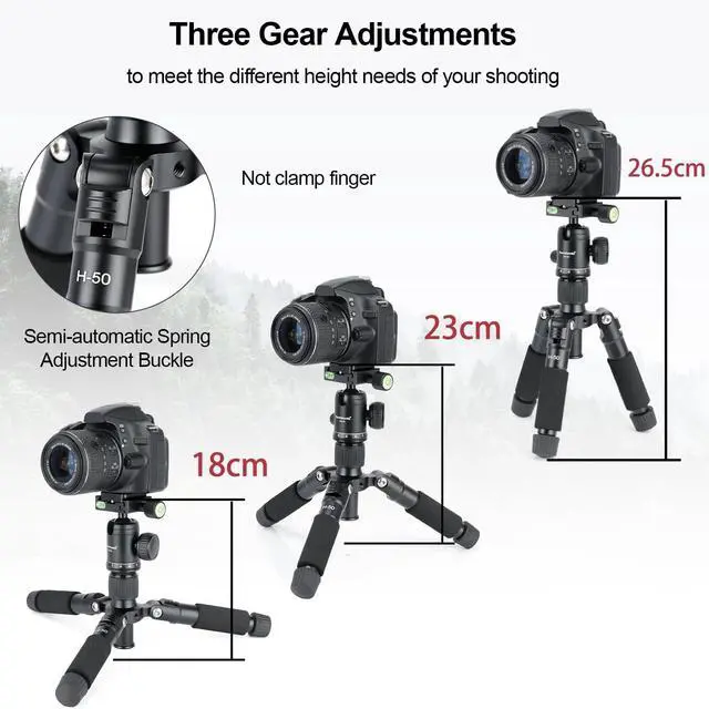 : ) The tabletop tripod is made of Aluminum Alloy, load up to 5kg, durable and solid; With the use of a vlogging tripod, it can achieve greater performance and maintain image quality for cropping larger picture sizes ^^: ) Utilizing a 5-section leg design and a quick tightening mechanism, this mini tripod allows for quick and easy height adjustments, with a working height range of 7inch-20inch / 18cm-51cm. Three kinds of Angle limit design to meet the needs of different heights and different scenes. Suitable for macro shooting, landscape shooting, desktop live broadcast, handheld Vlog, video conference, live broadcast, low level shooting, product still life shooting, electronic product evaluation, etc