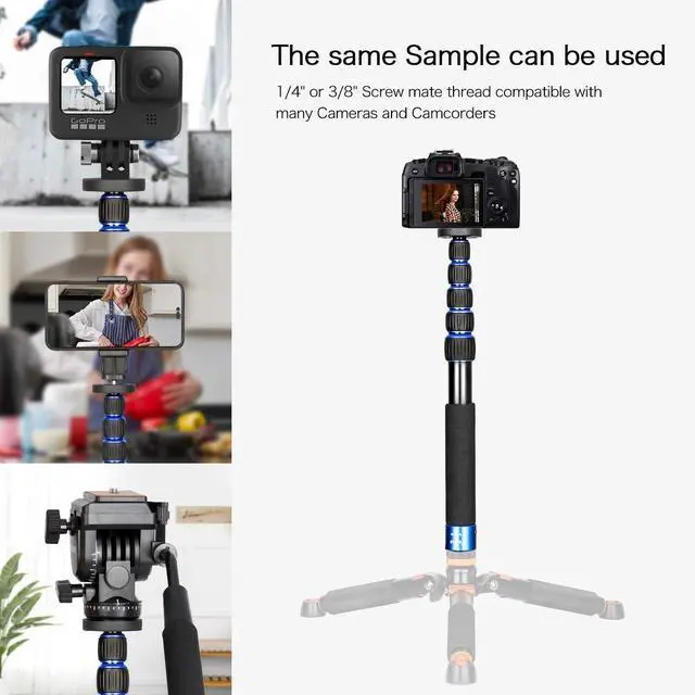 Folding size is only 38CMFeatures: Aluminum alloy structure, max tube diameter 28mm, strong load capacity, up to 10kg / 22lbs. 6-section design, extendable height from 38cm to 156cm. Quick lock system for length adjustment, securely lock the unipod. 3/8" thread at the bottom to attach it on mini tripod. Foam handle with strong load capacity, it can also be a hiking stick when you needs. 1/4" to 3/8" adapter to better meet you needs.