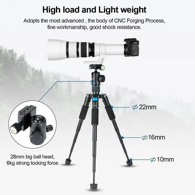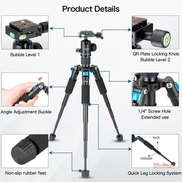 ^^: ) 360 swivel ball head with bubble level and Arca type quick release plate provides 360 panoramic movements and a 90 notch for vertical shooting scenarios, allowing you to take photos at any angle with horizontally and vertically.