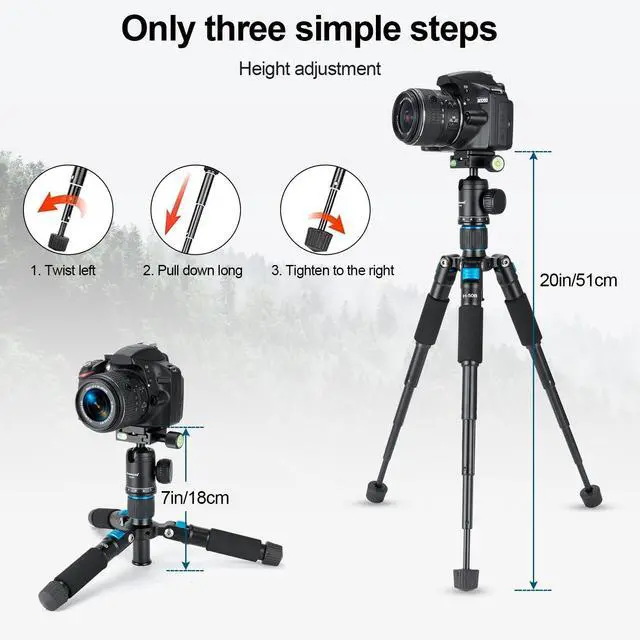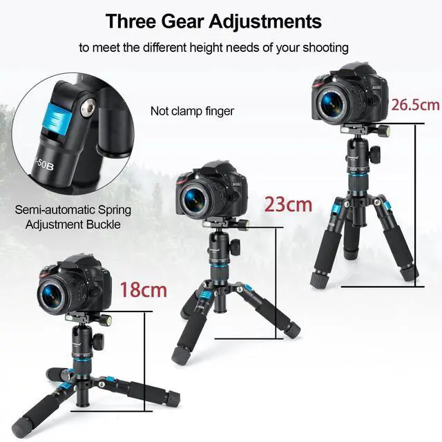 : ) The tabletop tripod is made of Aluminum Alloy, load up to 5kg, durable and solid; With the use of a vlogging tripod, it can achieve greater performance and maintain image quality for cropping larger picture sizes ^^: ) Utilizing a 5-section leg design and a quick tightening mechanism, this mini tripod allows for quick and easy height adjustments, with a working height range of 7inch-20inch / 18cm-51cm. Three kinds of Angle limit design to meet the needs of different heights and different scenes. Suitable for macro shooting, landscape shooting, desktop live broadcast, handheld Vlog, video conference, live broadcast, low level shooting, product still life shooting, electronic product evaluation, etc