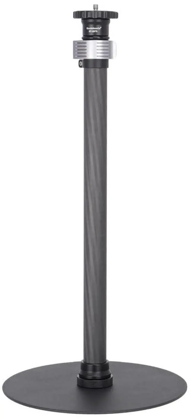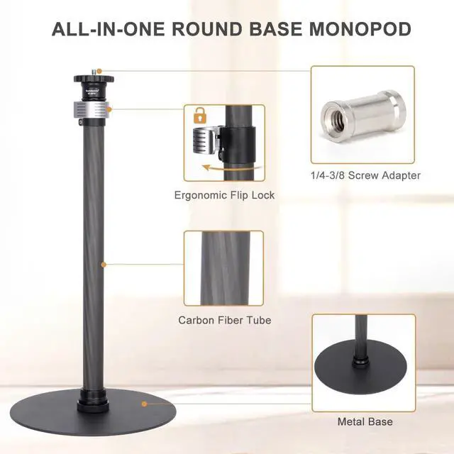 Sturdy & Stable Construction: The Monopod Leg tubes are made of 10X high-density Carbon Fiber. Better heat resistance and corrosion resistance. 25mm thick Carbon Fiber tubes and 20cm diameter heavy-duty round base provides stable support. Load up to 33 lbs ^^ Quick height adjustment via lever lock working height from 16in - 28in. ^^ Universal Mounting Plate with Reversible 1/4" & 3/8" screw allows mounting of virtually any camera, camcorder, ball head, webcam, microphone, phone holder, monitor, light etc ^^ The bottom has a non-slip silicone pad to avoid scratching the surface of the table or desk and will reliably and solidly support your kit.