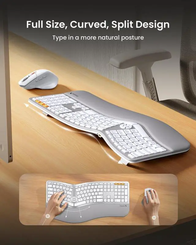Full-size Ergonomic Design: The wireless ergonomic keyboard features with full size layout, curved and split keyframe design, which helps to position your wrist and forearm in a more natural, relaxed posture. Scooped keys perfectly match the shape of your fingertips, offering quick response with every keystroke. Premium comfort and productivity for all-day typing.