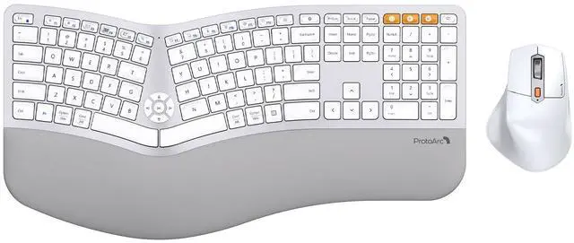 ProtoArc Ergonomic Wireless Keyboard Mouse, EKM01 Plus Full Size Ergo Bluetooth Keyboard Mouse Combo, Split Design, Wrist Rest, Multi-Device, Rechargeable, for Windows/Mac OS - White and Silver
