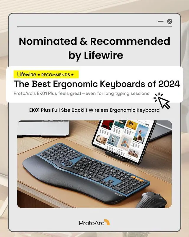 • Full-Size Ergonomic Comfort: The ProtoArc Ergonomic Keyboard features a unique curved split-frame design that actively reduces strain on your wrists and forearms and promotes proper posture. The scooped keys are crafted to fit your fingertips perfectly, making typing effortless and natural. Please note: we recommend checking the dimensions before ordering to ensure an ideal fit for your workspace. (While our full-size ergonomic keyboard enhances productivity, it may occupy more desk space)