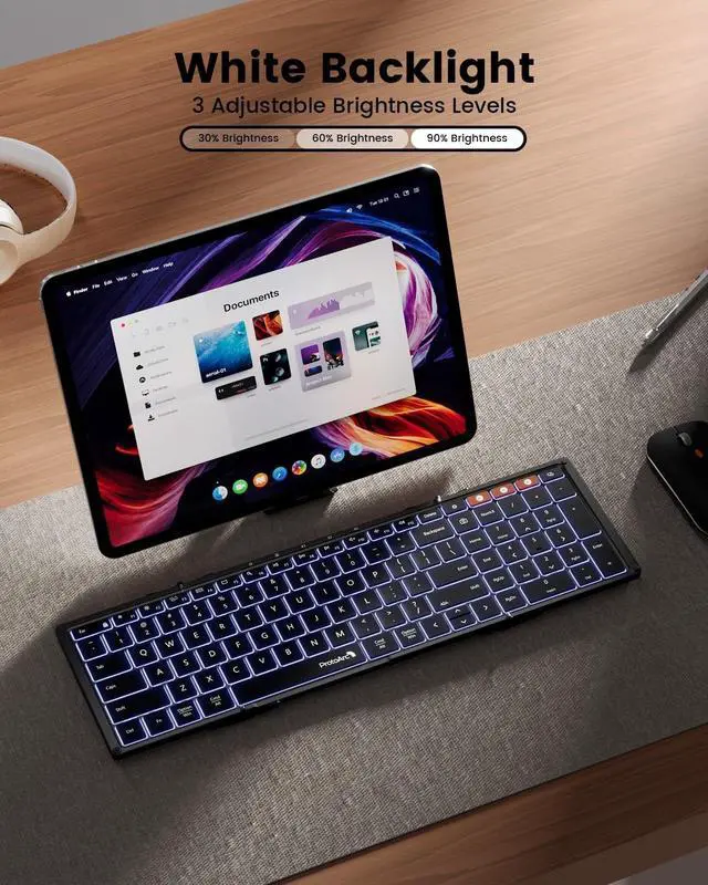 Tri-fold Full Size Keyboard Our backlit bluetooth keyboard is designed in tri-fold and compact enough for carry. 105-key standard full size QWERTY layout keyboard with number keypad and entire row of shortcut keys, you can type quickly and accurately on a laptop-like keyboard, making your work easier and more productive ^^ Backlit Folding Keyboard This small keyboard has three-level adjustable brightness and white backlit. It makes your typing more easy and convenient in any dim condition. You can switch the compact keyboard brightness at night to protect your eyes (Press Fn+Backlit Key to adjust brightness or thrn off the light) ^^ Portable for Travel The collasible keyboard can folds into a small size( 8.46 x 4.68 x 0.78 inch) for taking on the go.