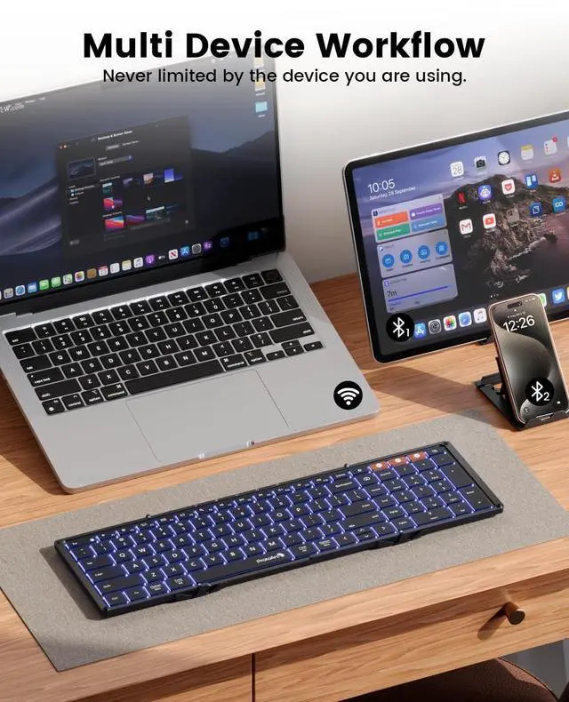 Come with a phone stand and small pu leather bag specially designed for this keyboard. It effortlessly fits into your bag, can be an ideal companion for your travels, coffee shop visits, business trips, flights, and more ^^ Multi Device Connection 3 Bluetooth 5.1 channels providing user-friendly workflow solutions. Suitable for small mobile devices such as iPad iPhone Steam Deck or Android phones and tablets, also works well on desktop devices such as laptops, computers with bluetooth. Compatible with Android, Windows, iPad OS, Mac OS, iOS, etc ^^ Type C RechargeableThe fold up keyboard have built-in rechargeable battery, allows standby time up to 150 days.