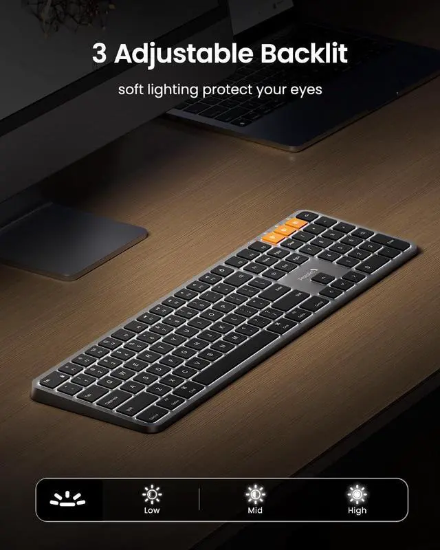 Adjustable Backlit Keys: This mac wireless keyboard features soft white LED backlighting with three adjustable brightness levels (low, medium, high). Its ideal for low-light environments, providing gentle illumination thats easy on the eyes. Customize the brightness to your preference with ease ^^ Switch Up to 3